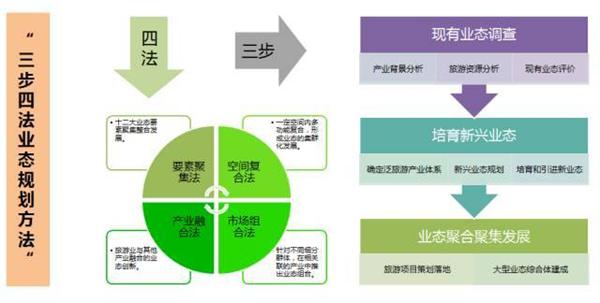 三步即:现有业态调查、培育新兴业态、业态聚合聚集发展;四法即:要素聚集法、空间复合法、市场组合法、产业融合法。