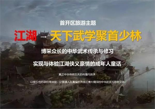 项目北区首开旅游景区的核心---江湖文化旅游小镇选取功夫江湖为旅游主线,力求表现广义的少林功夫文化,希望能够在登封这一具有浓郁功夫文化的环境中为游客打造一个具备现代休闲旅游体验的度假地。江湖文化旅游小镇未来将串联嵩山游客集散中心及禅宗少林·音乐大典这两大旅游引擎,形成集合文化旅游、商务会奖、主题客栈住宿为一体的综合型文旅度假小镇,结合登封优越的地理位置,形成未来中原地区新的旅游集散中心。